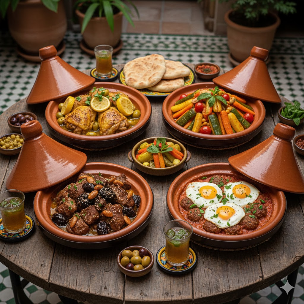 1. Tajine Poulet au Citron Confit & Olives 2. Tajine Viande auxPruneaux 3. Tajine de Légumes 4. Tajine Kefta & Œufs